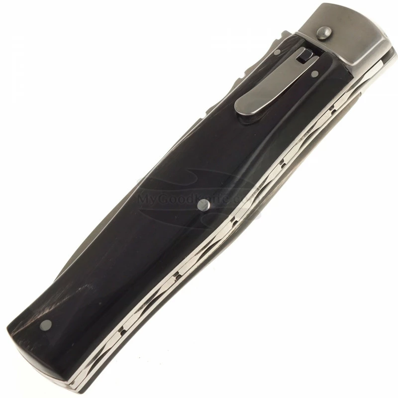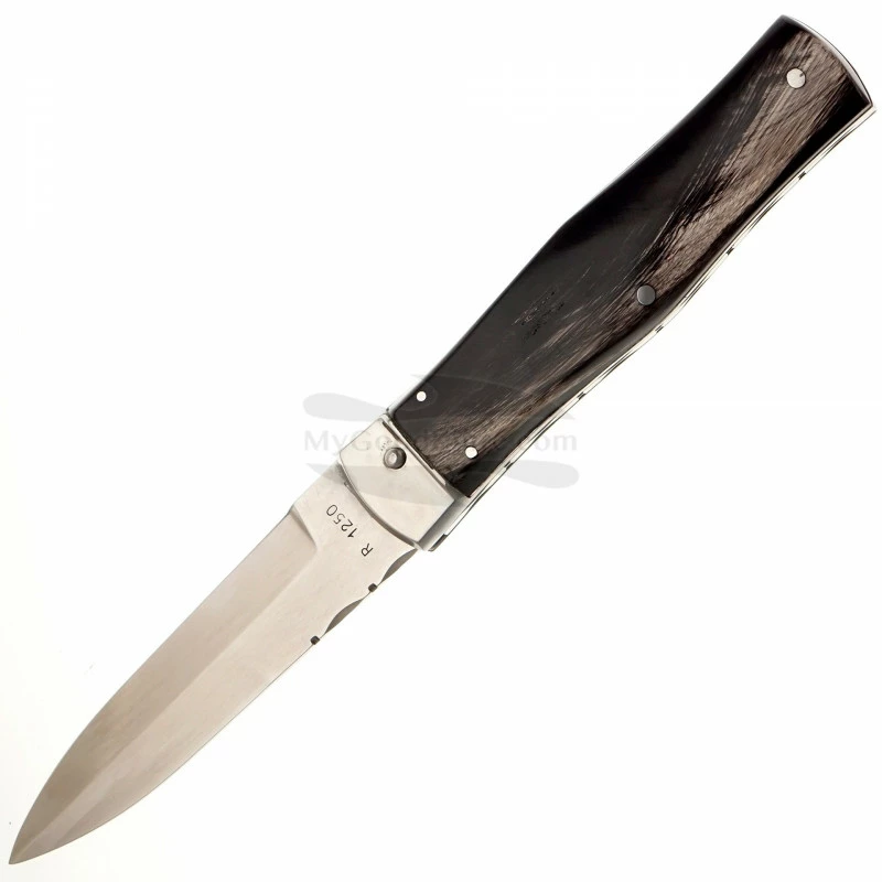 The luxurious and elegant Predator 241-RR-1/KP 126367 is automatic knife of company Mikov. The spear point blade is made of high quality Swedish stainless steel RWL-34 which is produced by cooling powder steels with a hardness of 58-61HRc. The knife has a decorated ridge sprint and the upper part of the blade. The handle is made of real buffalo horn. The profiled shape ensures a comfortable and secure grip even with wet hands. The cover is made of high-quality natural brown leather with an embossed manufacturer’s logo. The leather sheath is attached to a belt or equipment, which allows you to carry the knife in an upright position.