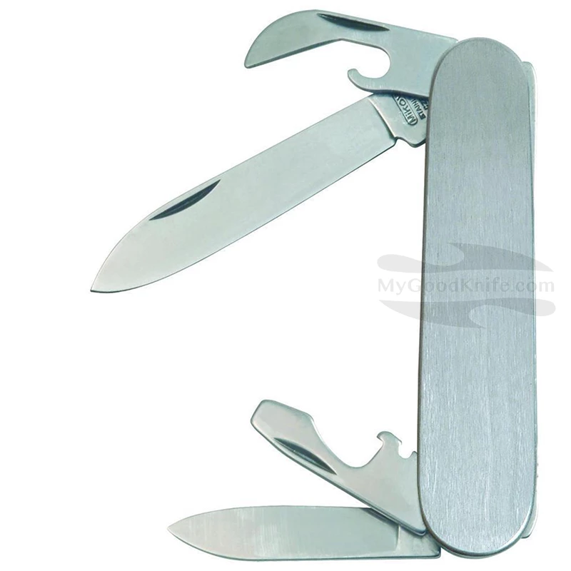 The multifunctional pocket knife Mikov Stovka 100-NN-4D 120618 for everyday use. The model has two 420 stainless steel blades and a elegant stainless steel handle. The model has a can and bottle opener, a screwdriver and a wire stripper.