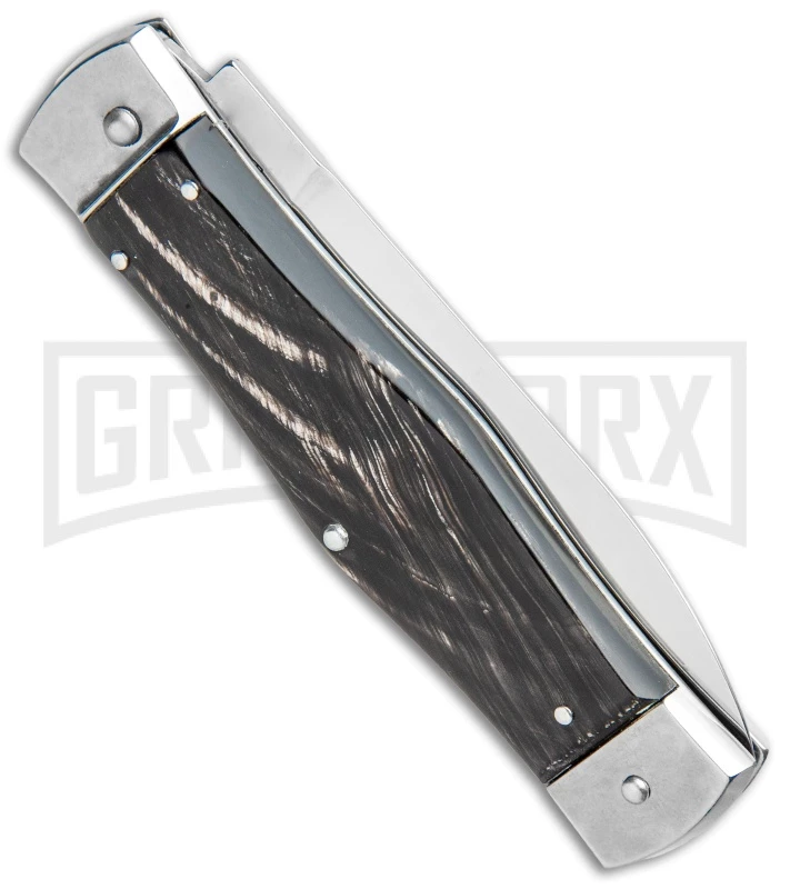 The Mikov 241 automatic knives come from the Czech Republic. This model features dark horn scales and a dagger-style stainless blade (one side is sharp and the other is a false edge) and double bolsters. The Mikov series is well-regarded for their “ready to work” no nonsense design. Rivet construction. The knife is opened using the small lever near the top of the knife. The lever rests flush in the handle when not in use.