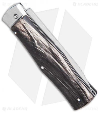 The Mikov Predator spring knife is a covet-worthy automatic knife that is made in the Czech Republic and features an elegant build. This model has dark horn scales and a bayonet-style stainless steel blade (one side is sharp and the other is a false edge). The Mikov series is well-regarded for their “ready to work” no nonsense design. Rivet construction. The knife is opened using the small lever near the top of the knife. The lever rests flush in the handle when not in use and acts as a safety when folded down.