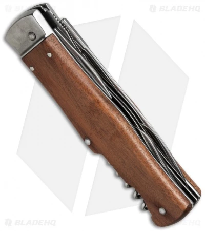 This model features 3-tools-in-1, a corkscrew, a wooden handle, and a dagger blade.
